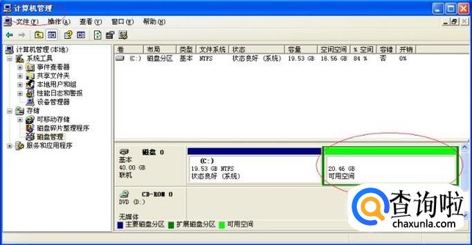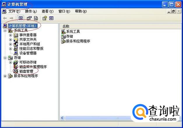唤出"计算机管理"程序窗口,选择"存储→磁盘管理"项。