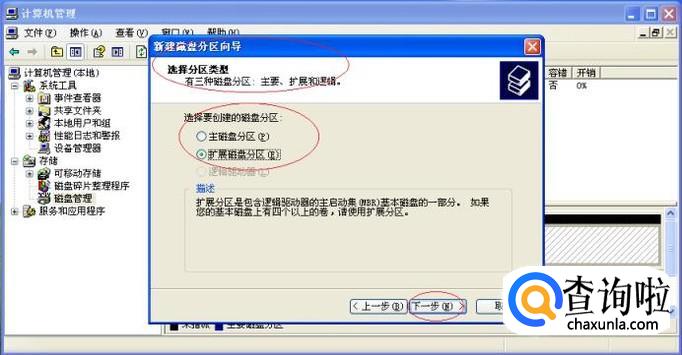 勾选"选择分区类型→扩展磁盘分区"单选框,设置完成点击"下一步"按钮。
