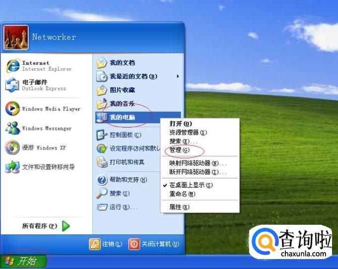 点击任务栏"开始"按钮,鼠标右击"我的电脑"图标选择"管理"项。