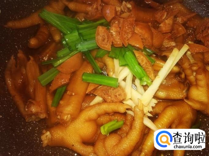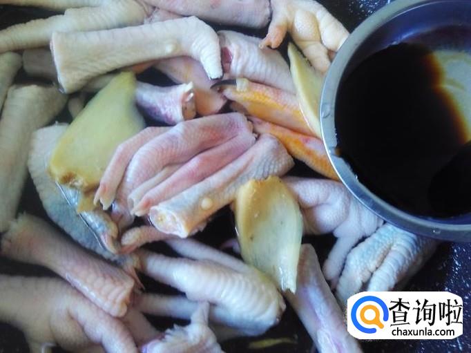 鸡脚400克,腌制过的柠檬2个,姜丝、青蒜适量,1勺生抽、1勺料酒、几滴老抽。