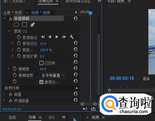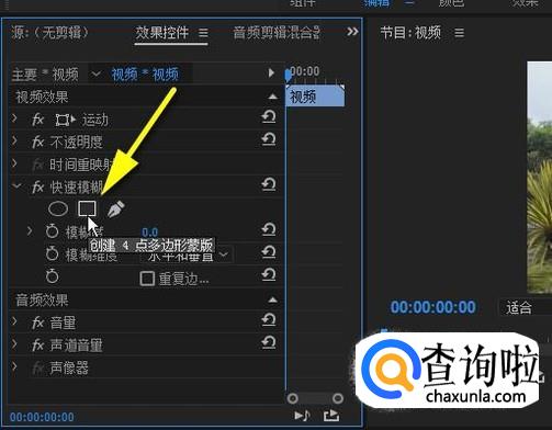 鼠标移到效果控件这里,点击“快速模糊”这里的矩形蒙版工具。创建一个矩形蒙版。