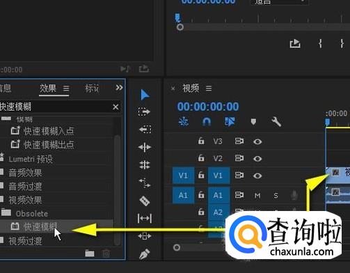 转到效果面板这里,在搜索框内输入“快速模糊”,搜索出“快速模糊”,并把“快速模糊”拉到序列上的视频轨道1