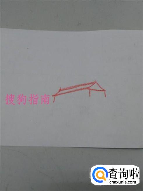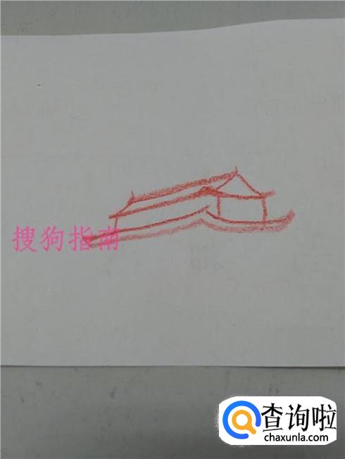 在三角形左侧,画一个平行四边形,在平行四边形的角上,延长一段线,表示城楼的角檐。