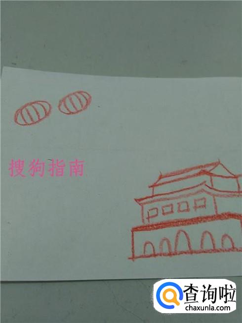 在天安门左上角,画两个椭圆形,表示灯笼。