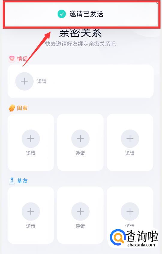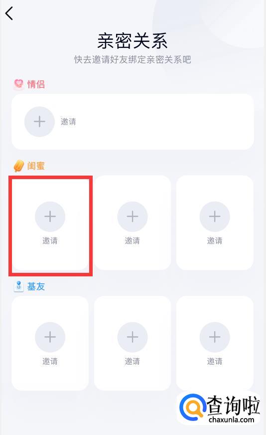 进入后可以看到,亲密关系分为3种:情侣、闺蜜、基友。我们点击“闺蜜”下方的“邀请”。