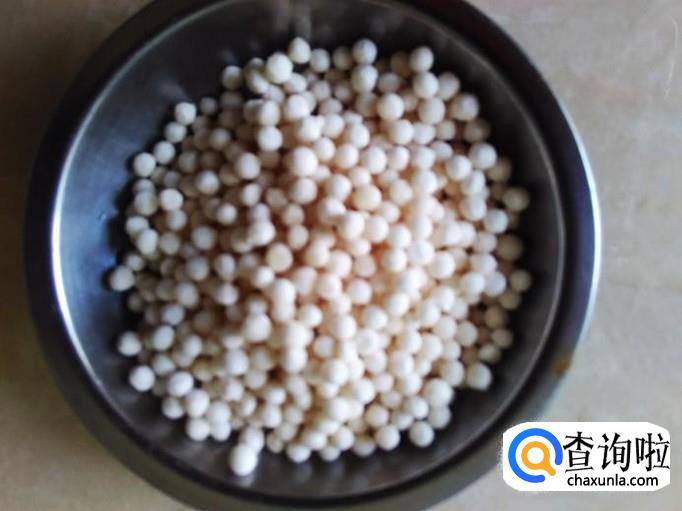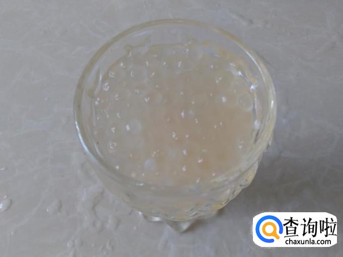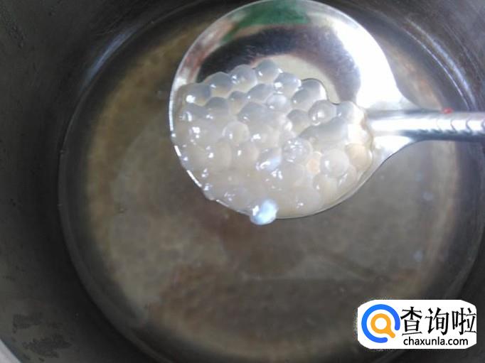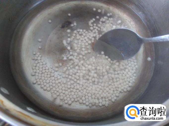 锅里装适量的水煮沸,然后放西米露进去,用勺子搅拌一下不给粘底。