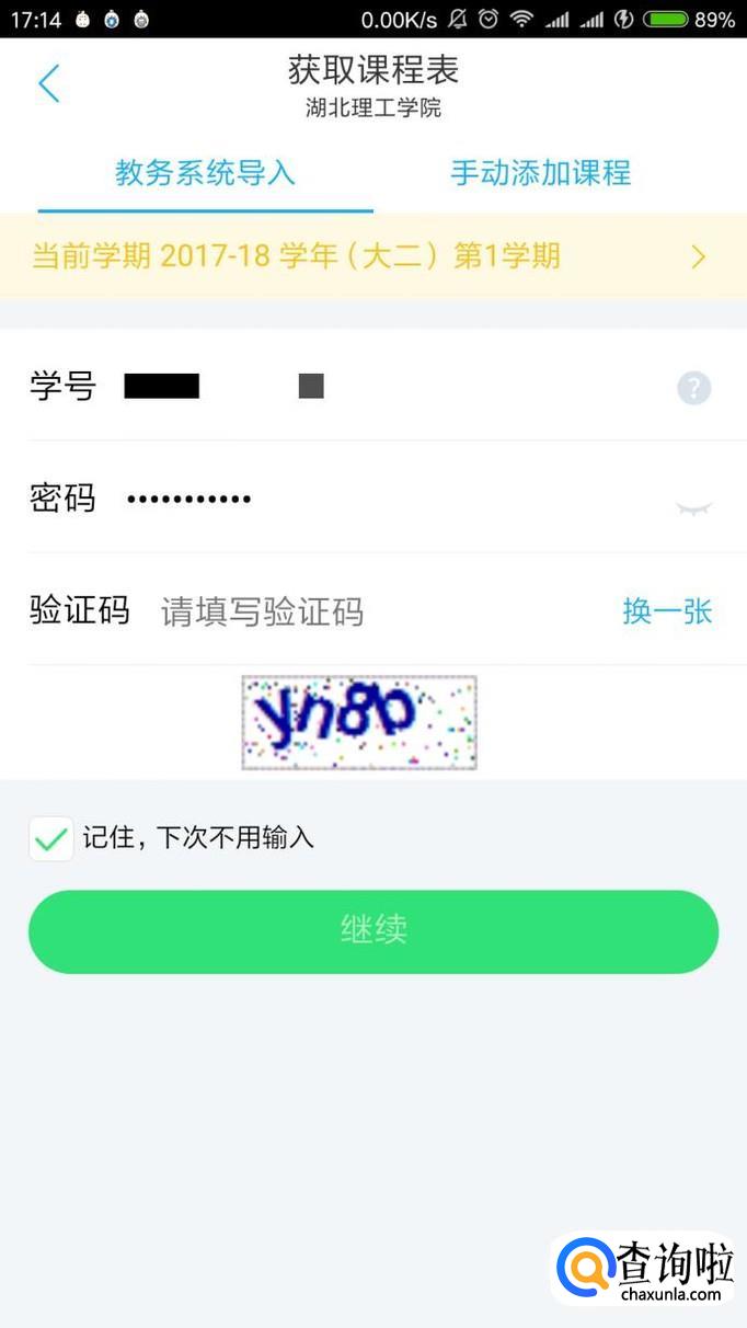 接下来界面会出现“从教务系统导入”和“手动添加课程”两个选项,我们选择“从教务系统导入”,输入学号,教务系统密码,验证码,完成后点击“继续”。