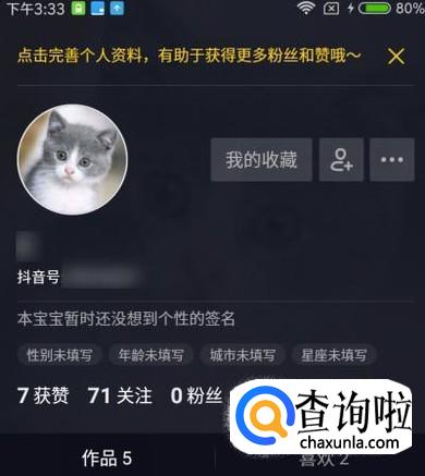 进入到个人主页这个页面中。在这里显示着自己的抖音号,发布的视频,收藏的视频、音乐等等信息。