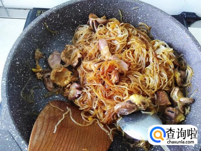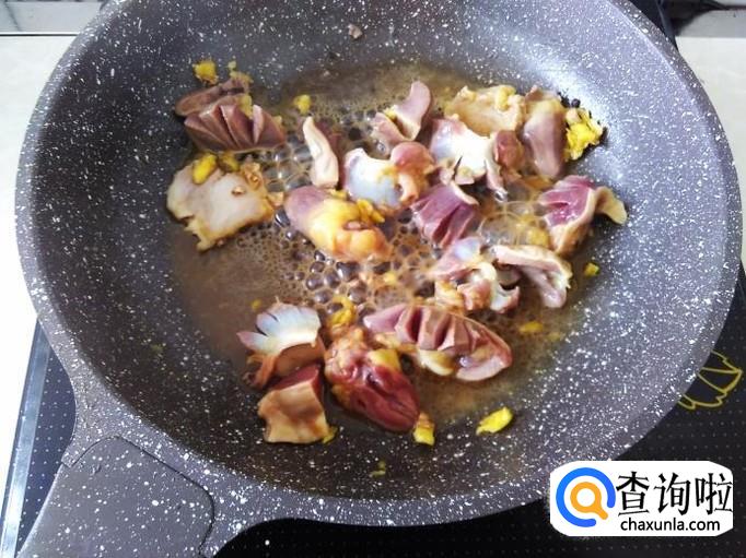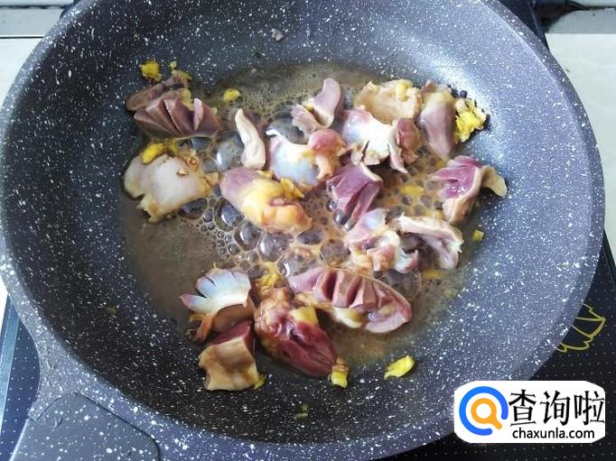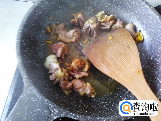 鸡胗下锅,翻炒一下。