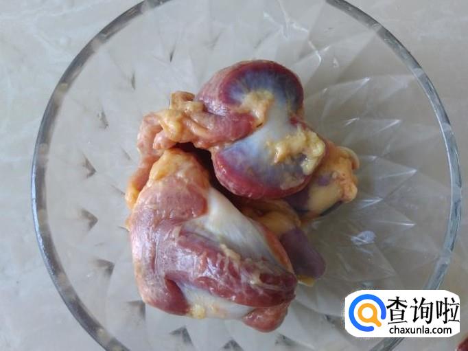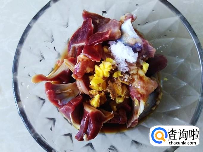 鸡胗洗干净切成片连刀,加盐、姜蓉、生抽、料酒腌制几分钟。