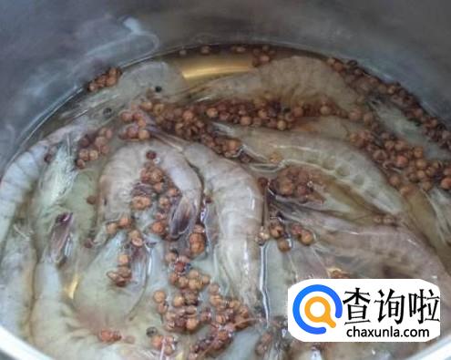 锅中放上清水,将清洗干净的虾放入锅中,在上面撒上花椒和盐,开始煮。