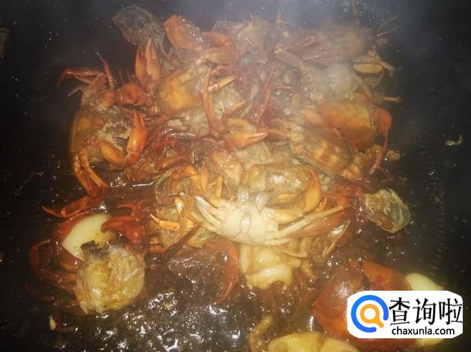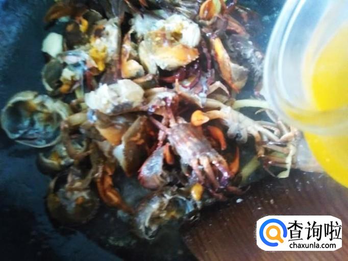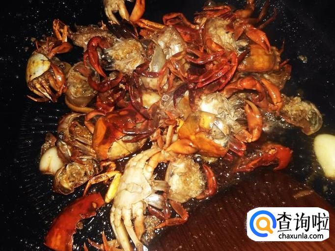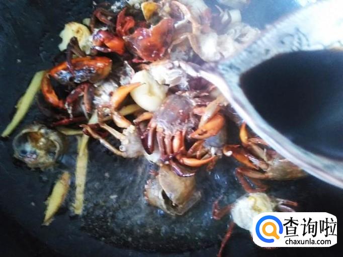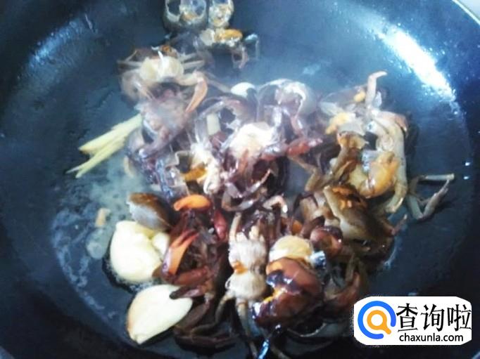 热锅下油,放姜丝蒜米进去爆出味来,然后放河蟹进去。