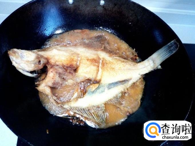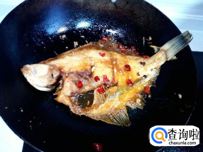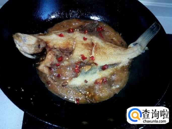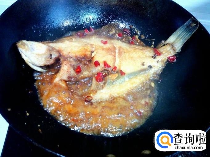 熬好料汁后,把煎炸好的鱼放入锅中,放入红干椒,转中火烧。用勺把料汁往鱼身上适当浇一下,慢慢转动锅使料汁和鱼均匀受热。