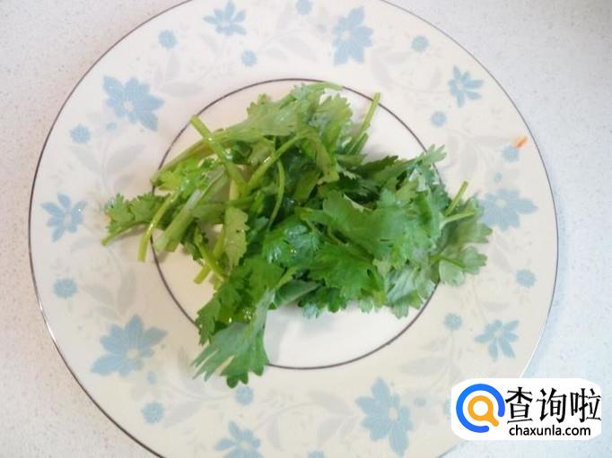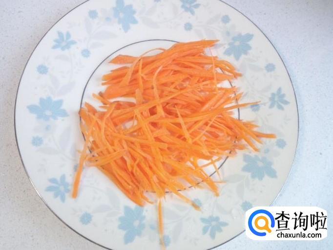 胡萝卜去皮用水清洗干净,切成细丝。香菜用水清洗干净,控干水分,切成段。