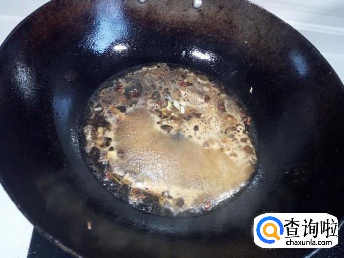 盛出炸鱼多余的油,留少许油在锅中加热,油热后放入花椒,葱,姜,蒜,爆锅,然后把调和好的料汁倒入锅中,放入少量的水,烧开,小火慢熬一会(一分钟)。