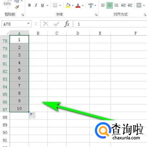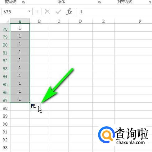 点住向下拉,拉到截止单元格;这时,我们看到单元格全部显示为1;而最后一个单元格右侧有一个填充选项按钮。鼠标点击此按钮。