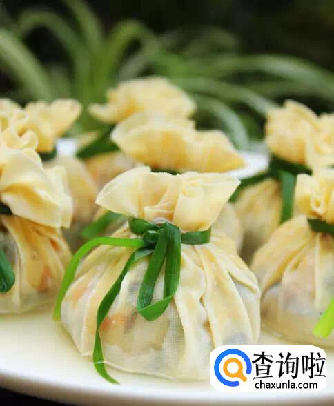 8、韭菜在热水中烫一下,过凉开水,系在炖好的八宝钱袋上做下装饰即可。