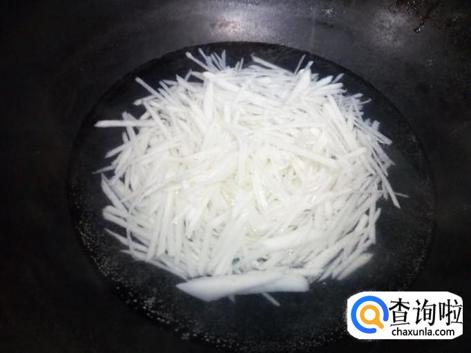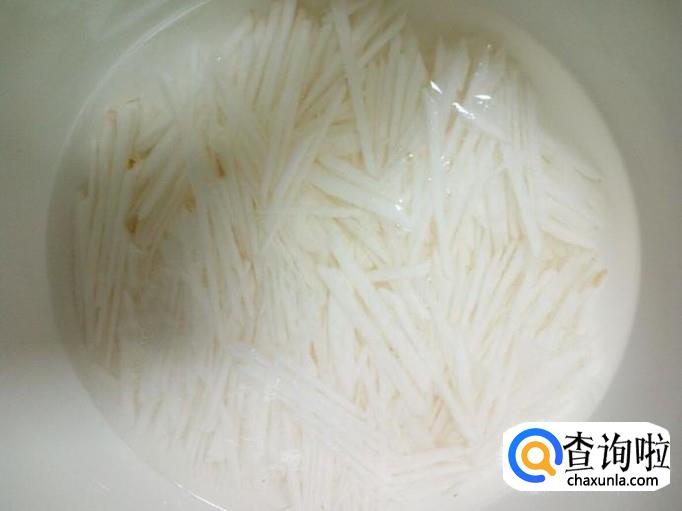山药去皮,用水清洗干净,控干水分,切成丝。放入水中浸泡一下,再用水投洗干净,控干水分。