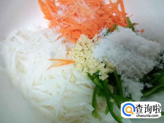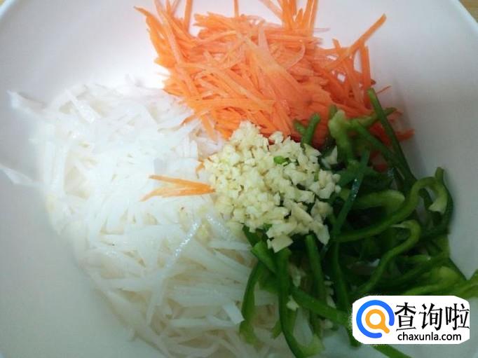 把沥干水分的山药,切好的胡萝卜丝,青椒丝,蒜末,一起放入碗中。放入白糖,醋(白糖,醋的放入量根据自己喜欢的口味掌握),放少许盐,少许味精,拌和均匀。