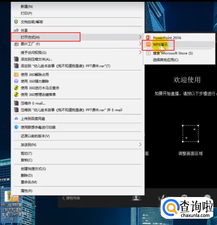 先打开钉钉开课直播助手,然后右键选择要直播的ppt课件,打开方式建议选择wps。