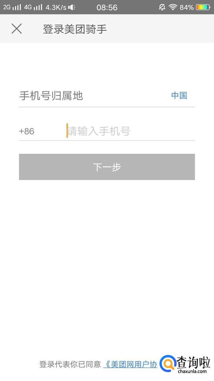 打开美团骑手,输入手机号码,登录自己的账户,如图所示。