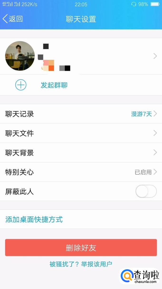 进入具体聊天界面之后,点击右上角的人形图标,进入好友具体设置界面。