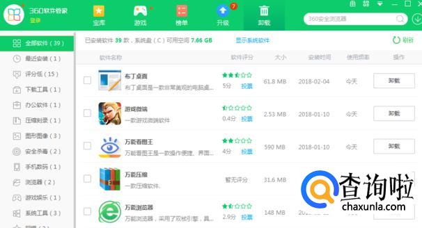 下载完成后,进入360软件管家,点击“卸载”,在列表里选中想要卸载的程序,点击卸载。