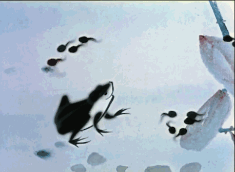 随着小蝌蚪们一而再再而三的认错母亲,到后来终于找到母亲,自己也长成母亲的样子,故事圆满结束了。而这一群群的小蝌蚪在水墨画上,不过就是一群的小墨点,而创作者们却用一帧帧不同动作形成的游动和节奏,使得小墨点都变成了灵活灵现的小蝌蚪们,给予了他们生命力。