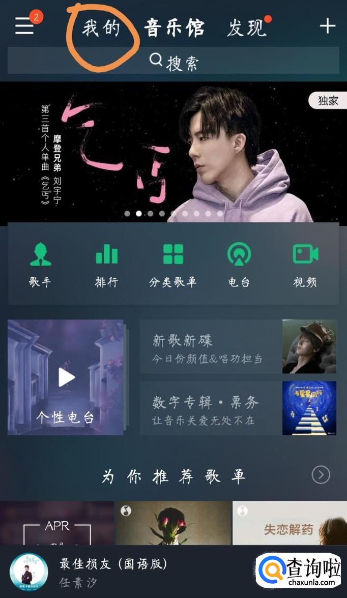 首先在QQ音乐主界面的最上方中找到“我的”选项,点击进入
