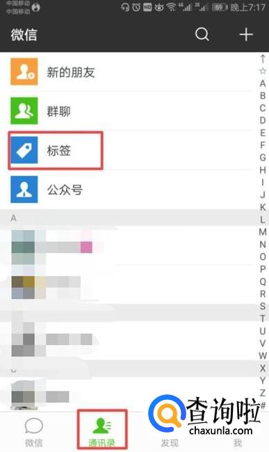 首先,我们登录我们手机上的微信,然后我们点击通讯录,之后我们点击标签;