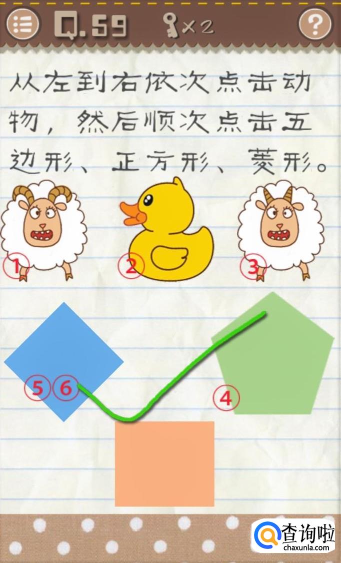 59:从左到右依次点击动物,然后顺次点击五边形、正方形,菱形。