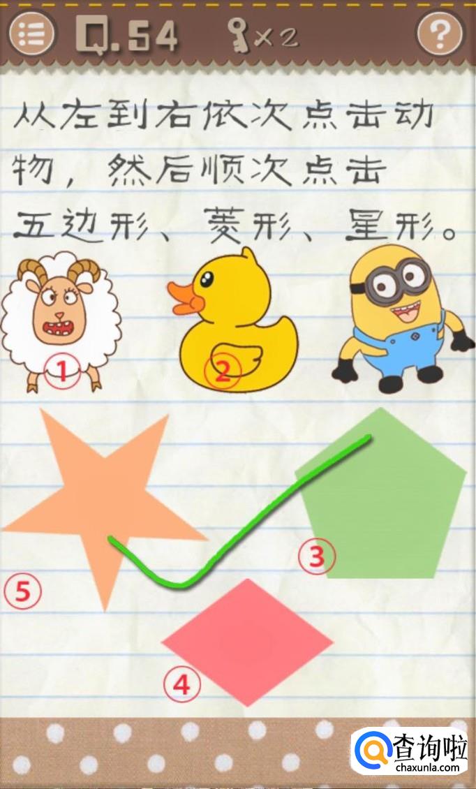 54:从左到右依次点击动物,然后顺次点击五边形、菱形、星形。
