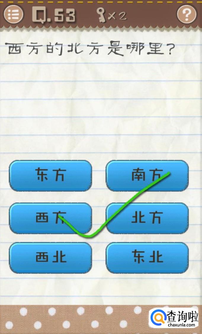 如图所示,上北下南,西方的北方就是东方,点击“东方”即可过关