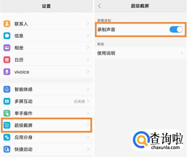 进入【设置】→【截屏】→ 【超级截屏】→将【录制声音】打开开启后,在屏幕录制时,可以将声音录制下来。