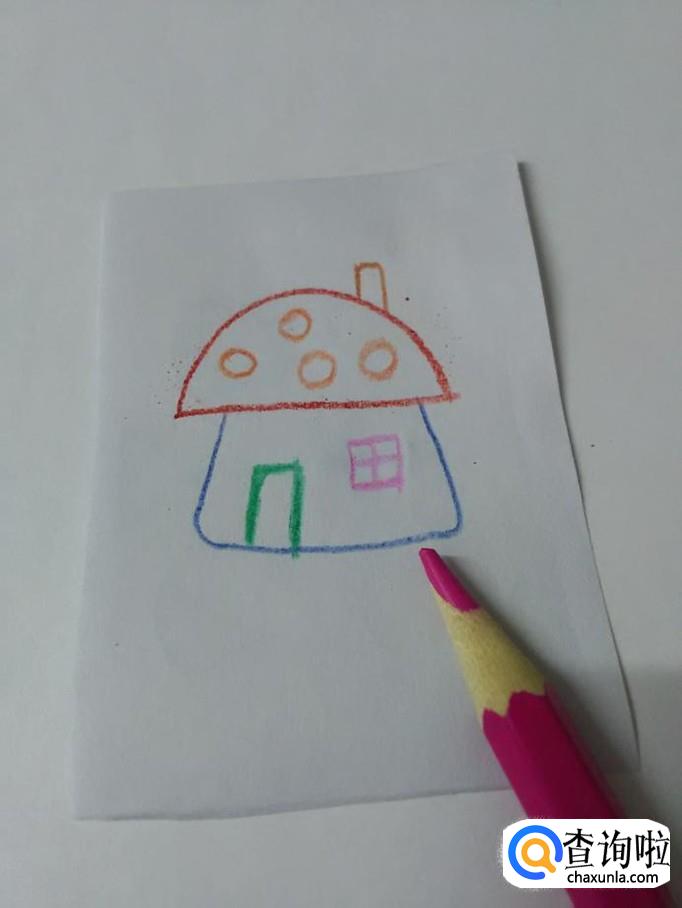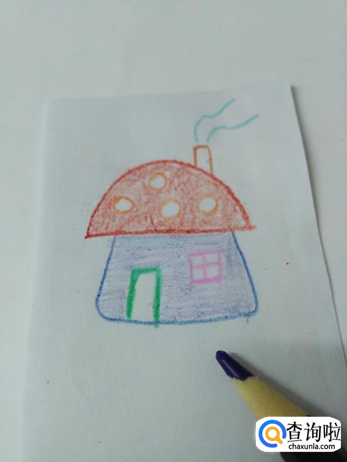 用紫色涂墙壁,门窗不要涂,这样,一栋漂亮的蘑菇房子就画完了。
