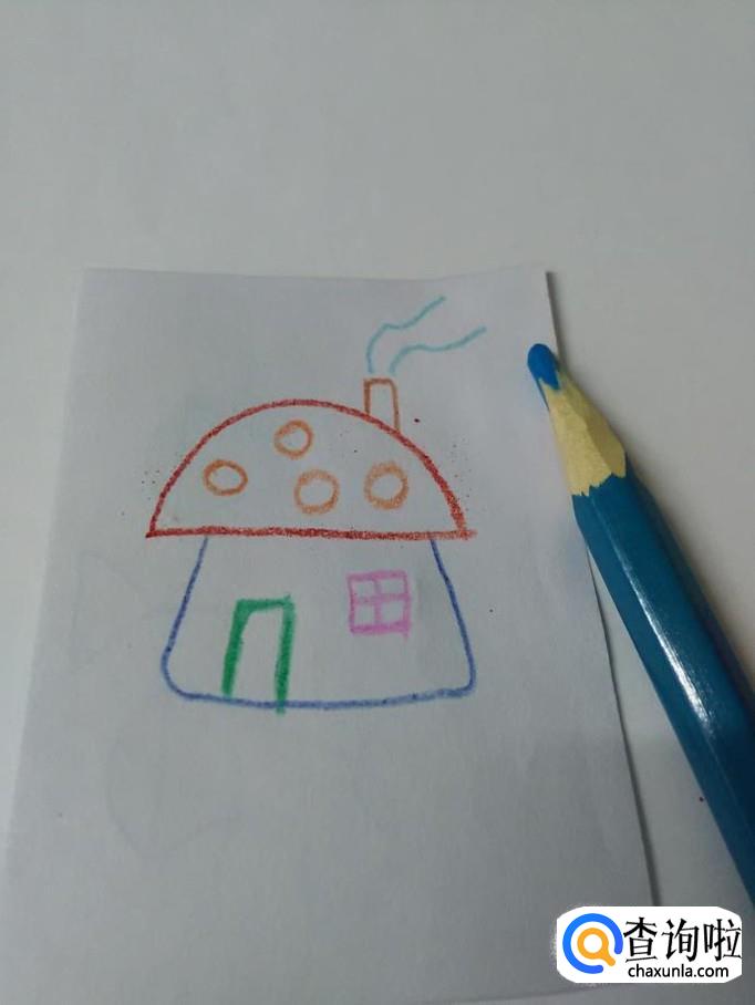 用浅蓝色在烟囱上面画两条曲线,表示青烟。到这里,线条就画完了。