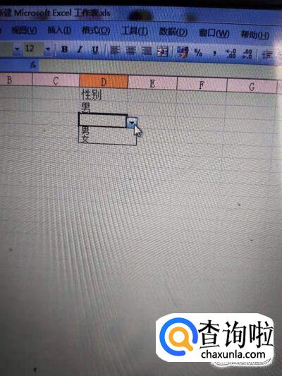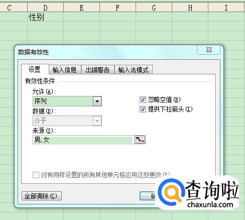 在数据有效性中设置数据有效性的条件为序列,来源中输入男,女,中间用英文下的逗号分开。