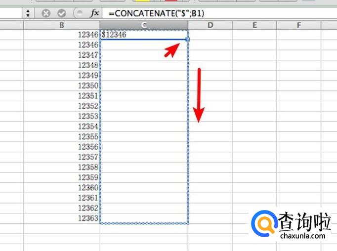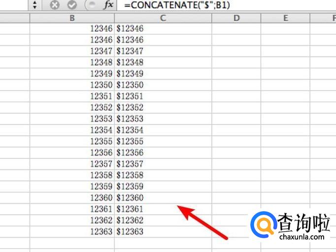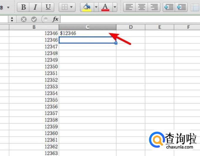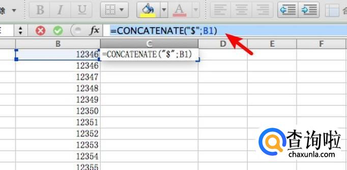 选中C1单元格,在上方的公式栏输入 =CONCATENATE("";B1)
