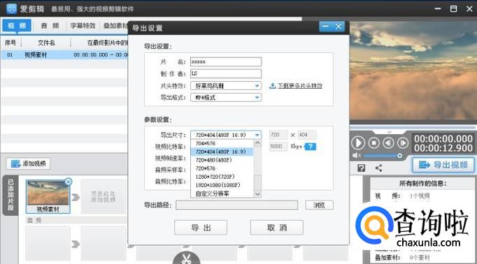 然后将鼠标光标移动到软件的右侧,点击 导出视频 选项,在参数设置的视频尺寸处选择合适的视频尺寸并且设置导出路径后,再点击 导出 就可以了