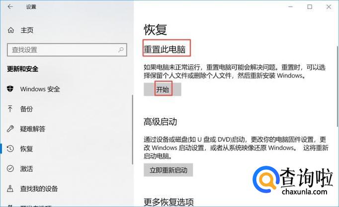 弹出的界面,我们看到重置此电脑,这个就是系统还原,我们点击开始;
