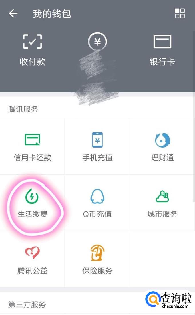 在下面,有生活缴费这一功能,点击下图划圈处“生活缴费”这四个字。