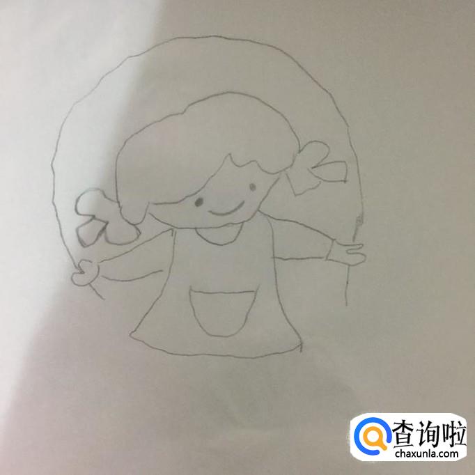 接着画出小女孩的脸,眼睛和嘴巴,如下图所示。画小女孩眼睛的时候,只要用两个小圆点,替代就可以了。