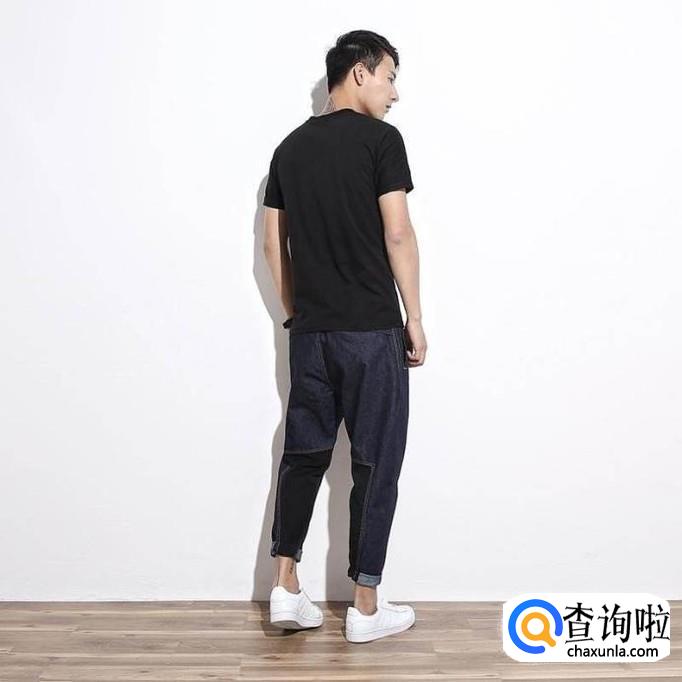 如果实在是不知道黑色T恤搭配什么裤子的话,可以搭配牛仔裤,这个适合任何年龄穿,也是一款百搭衣服。
