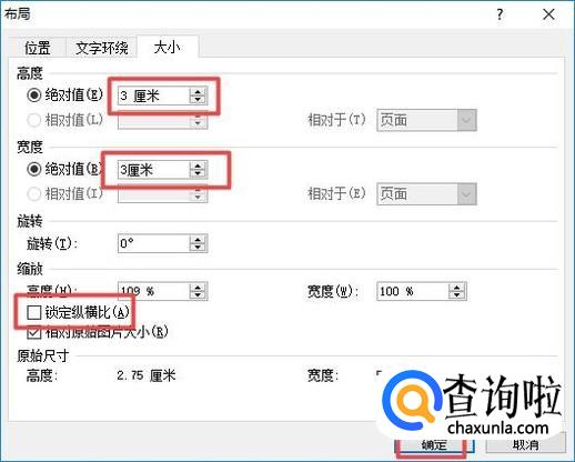 然后我们将锁定纵横比的勾选给取消掉,之后我们将高度和宽度都设置为3,然后我们点击确定;
