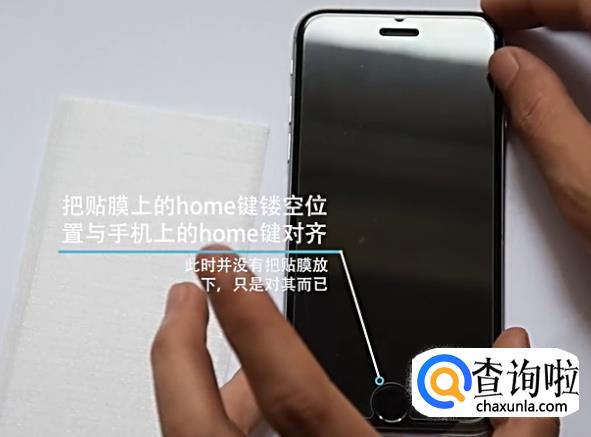再将钢化膜的下半部对齐home键,一定要将home键露出来,不然会影响以后使用。