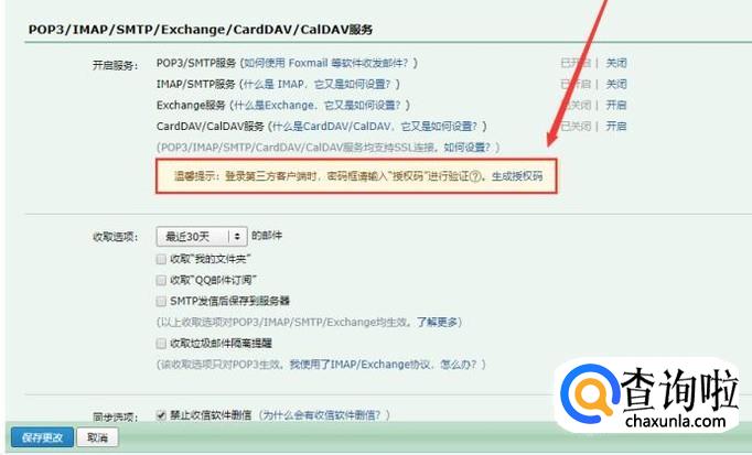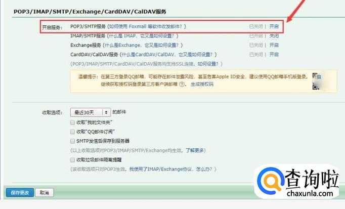 点击”账户“选项,下拉页面,找到”POP3/IMAP/SMTP/Exchange/CardDAV/CalDAV服务“,点击”POP3/SMTP服务“后面的”开启“。