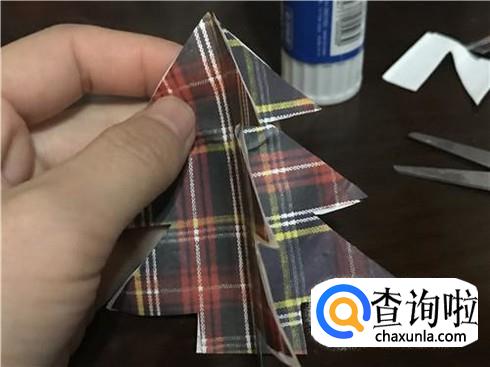 用固体胶固定。接着用固体胶将三张圣诞树纸张黏在一起,这样一颗树就做好了。
