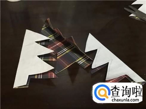 剪好。接着用剪刀将圣诞树剪下来,如图所示,大小尽量相同,这样才能黏在一起。