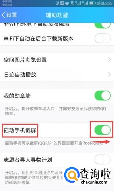 之后我们将摇动手机截屏的开关向右滑动打开,之后我们就可以摇动手机截屏了。