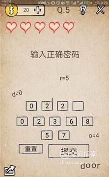 密码顺序:door。d=0、o=4、r=5,但选项中没有4,想到之前关卡3中的4=1,而选择中正好有1,不如一试。所以正确密码是:0115。